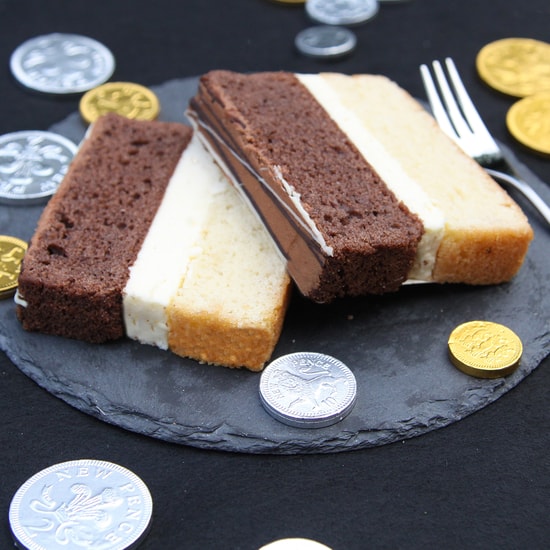 Our Millionaires Sponge has a Victoria and Chocolate Sponge sandwiched together with luxurious toffee and caramel buttercream. It is topped with yummy chocolate buttercream and drizzled with melted milk and white chocolate.