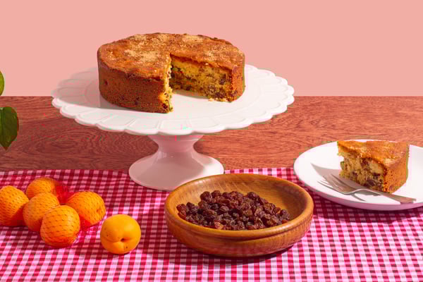 Our Farmhouse Cake is a punchy fruit cake, packed full of juicy apricots and sultanas, finished with an apricot jam glaze and a sprinkling of Demerara sugar. This delicious wholesome cake is perfect for the whole family as an afternoon treat or a simple celebration cake.