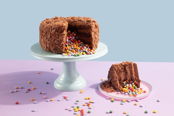 Our Surprise Gluten Free Pinata Cake has four layers of delicious and rich chocolate sponge, which are sandwiched together with a velvety smooth chocolate buttercream. To create the ultimate chocolate cake the chocolate buttercream and chocolate flakes are smothered all over the outside, which also gives a lovely bit of crunch. To top it all off there is a fun surprise in the middle - colourful chocolate beans.