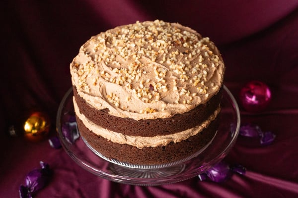 A little bit fancy, a little bit nostalgic and yes, unapologetically inspired by that purple-wrapped favourite. Layers of vegan caramel and hazelnut sponge, sandwiched with silky chocolate buttercream and topped with golden caramel shards and toasted hazelnuts. It’s rich, nutty, and unashamedly decadent. The vegan cake for those who skip the fruitcake. Make more indulgence, more “oohs” and “aahs”, and definitely no apologies for second helpings.