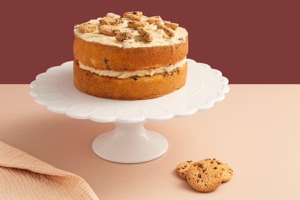 Light vegan vanilla sponge layered with chocolate chips and sandwiched with creamy, cookie flavoured buttercream, with chunks of crunchy cookies running through every bite. It is rich, comforting and unapologetically fun, with flavours that bring to mind classic cookie dough and fresh from the oven treats. Finished with a scattering of broken cookies on top, it proves that being a smart cookie sometimes means going all in. When cake meets cookies, smiles are pretty much guaranteed.