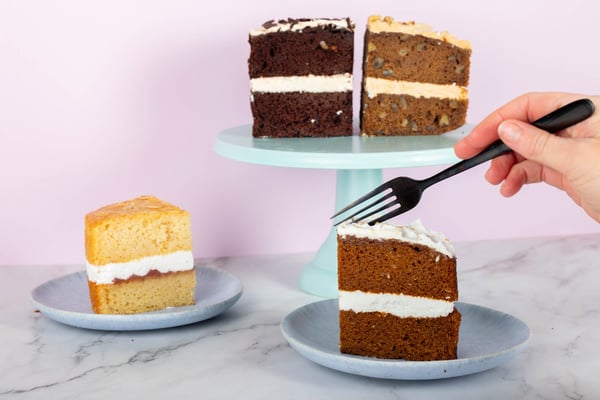 Why limit yourself to just one flavour when you can have four? We've crammed four NEW fantastic Vegan flavours into one delightful cake, making dessert decisions a thing of the past. Ginger and Lemon, Bakewell, Coffee and Walnut and a rich Chocolate Caramel – a whole lot of yum in every slice.