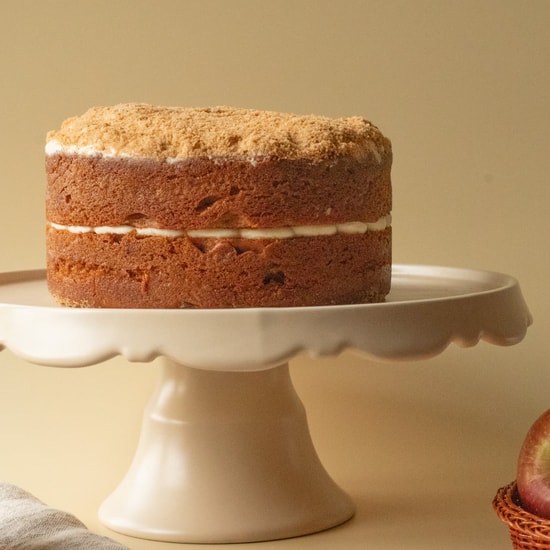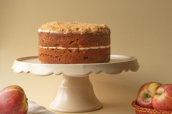 This cake is the apple of our eye. Light cinnamon sponge layers, generously dotted with real apple chunks and sandwiched with velvety vanilla buttercream and finished with a generous layer of crunchy sweet crumb. Perfect accompanied by your hot seasonal beverage of choice and scented spicy candle...oh and don't forget the cosy blanket!