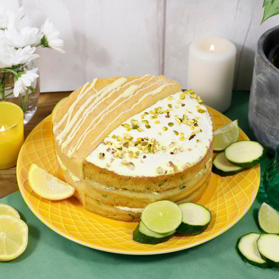 Half Zucchini and Lime: The three layers of sponge are made with fresh courgettes and lime flavouring to create a wonderfully light and airy sponge. The buttercream is flavoured with lime and crunchy, salty chopped pistachios sit on top.